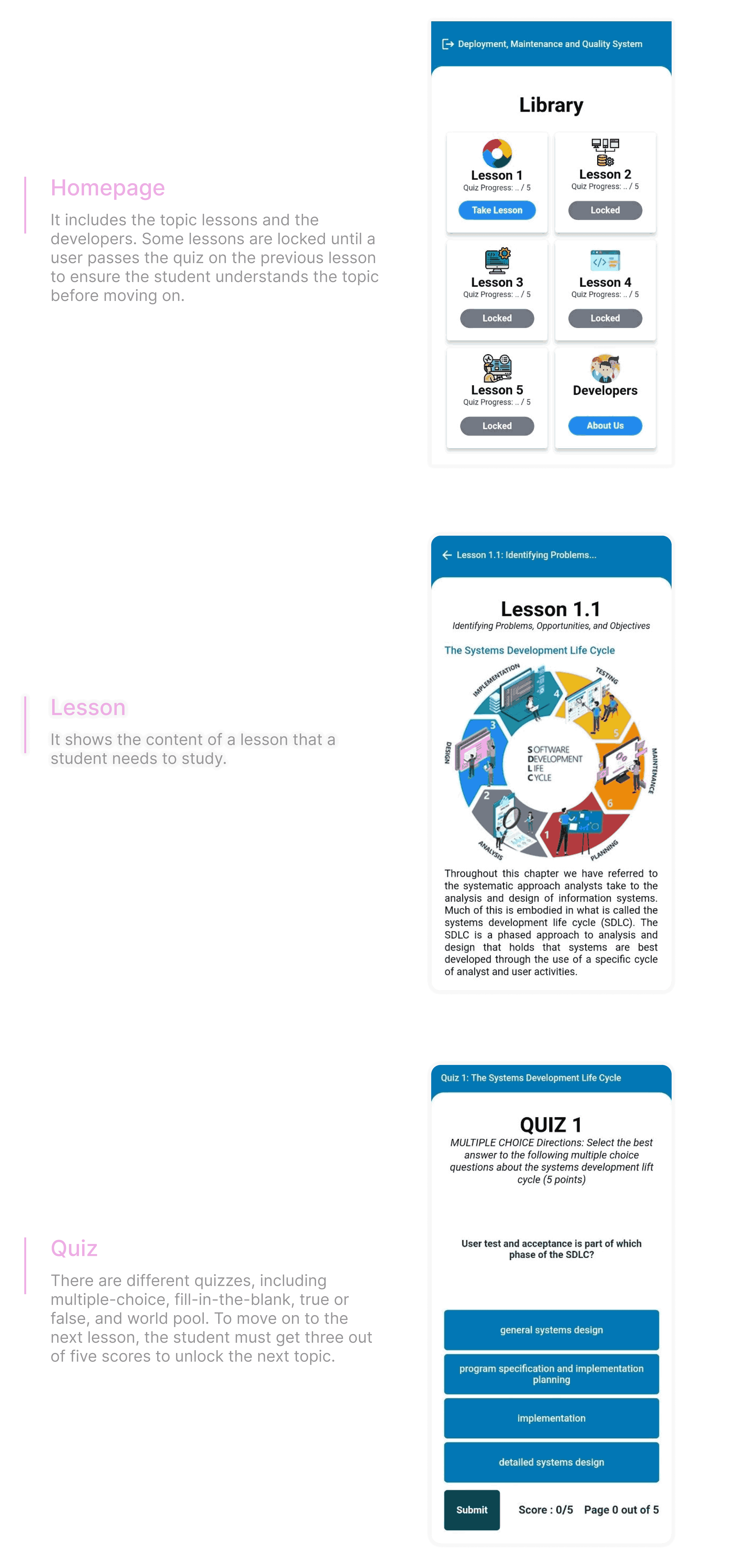 The mobile application titled "CAI for IS2" (Computer-Aided Instruction for Deployment, Maintenance, and Quality Assurance Subject) was developed to enhance students' learning efficiency. It allows students to progress at their own pace, offering topic lessons and assessments to gauge their understanding of the subject.