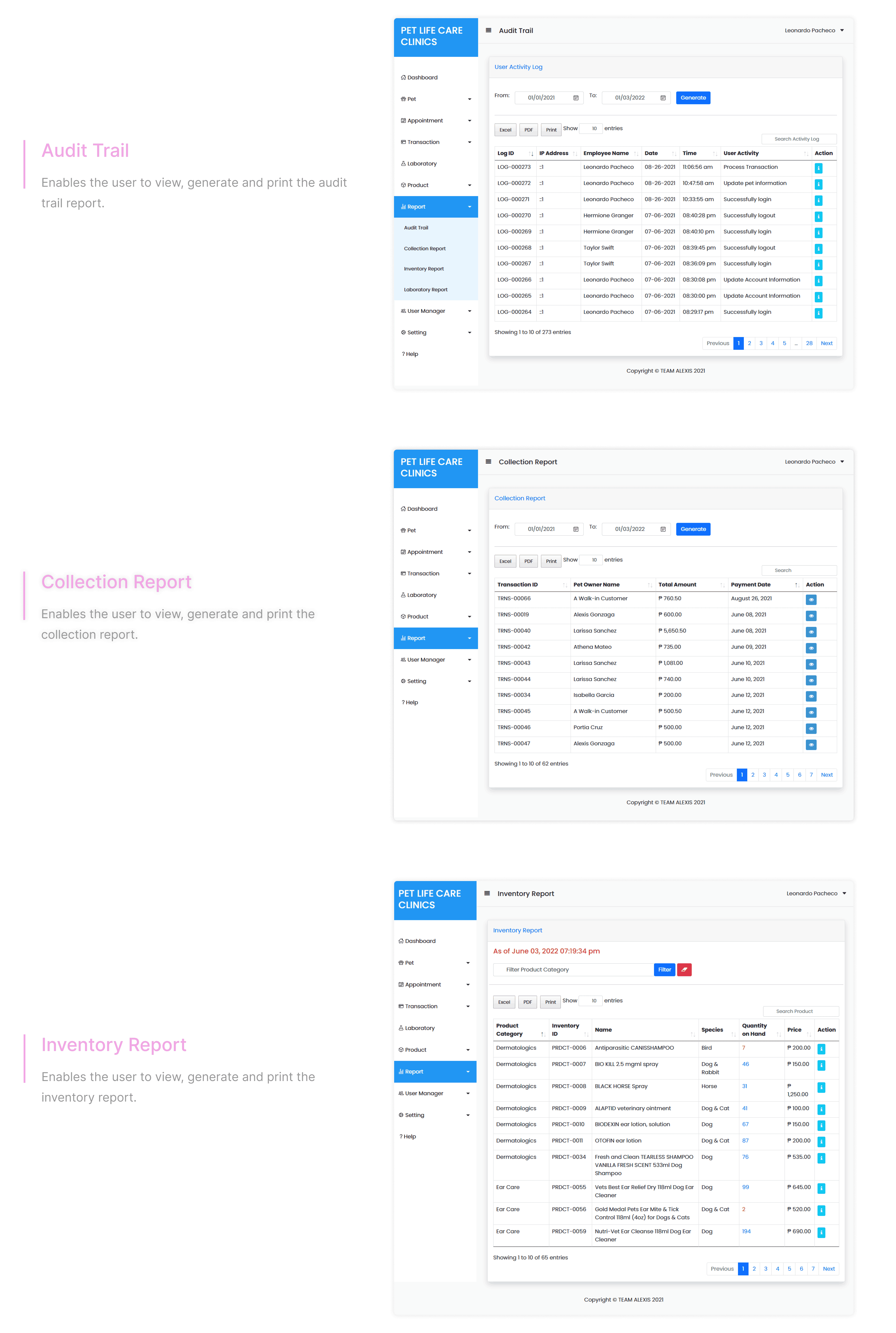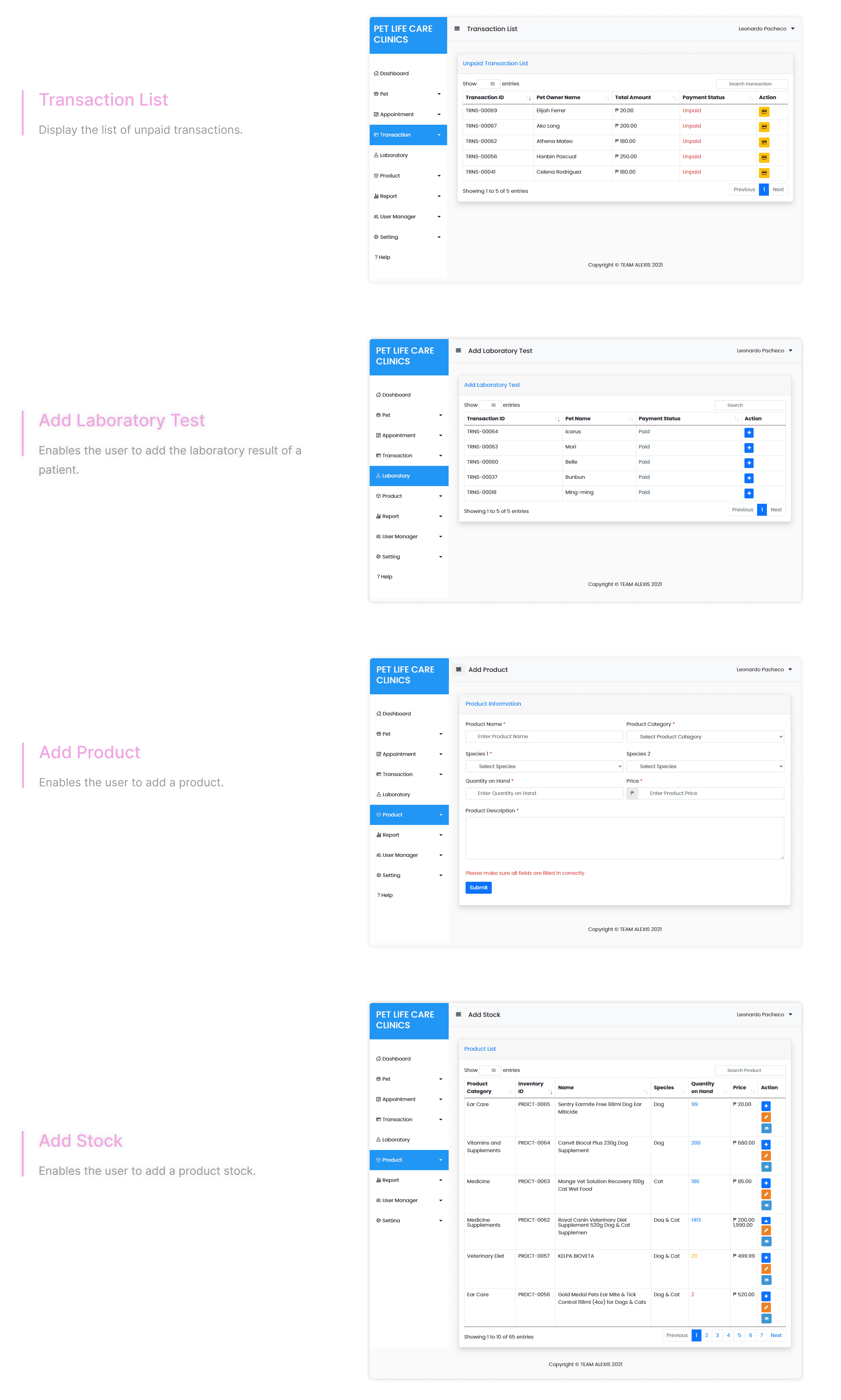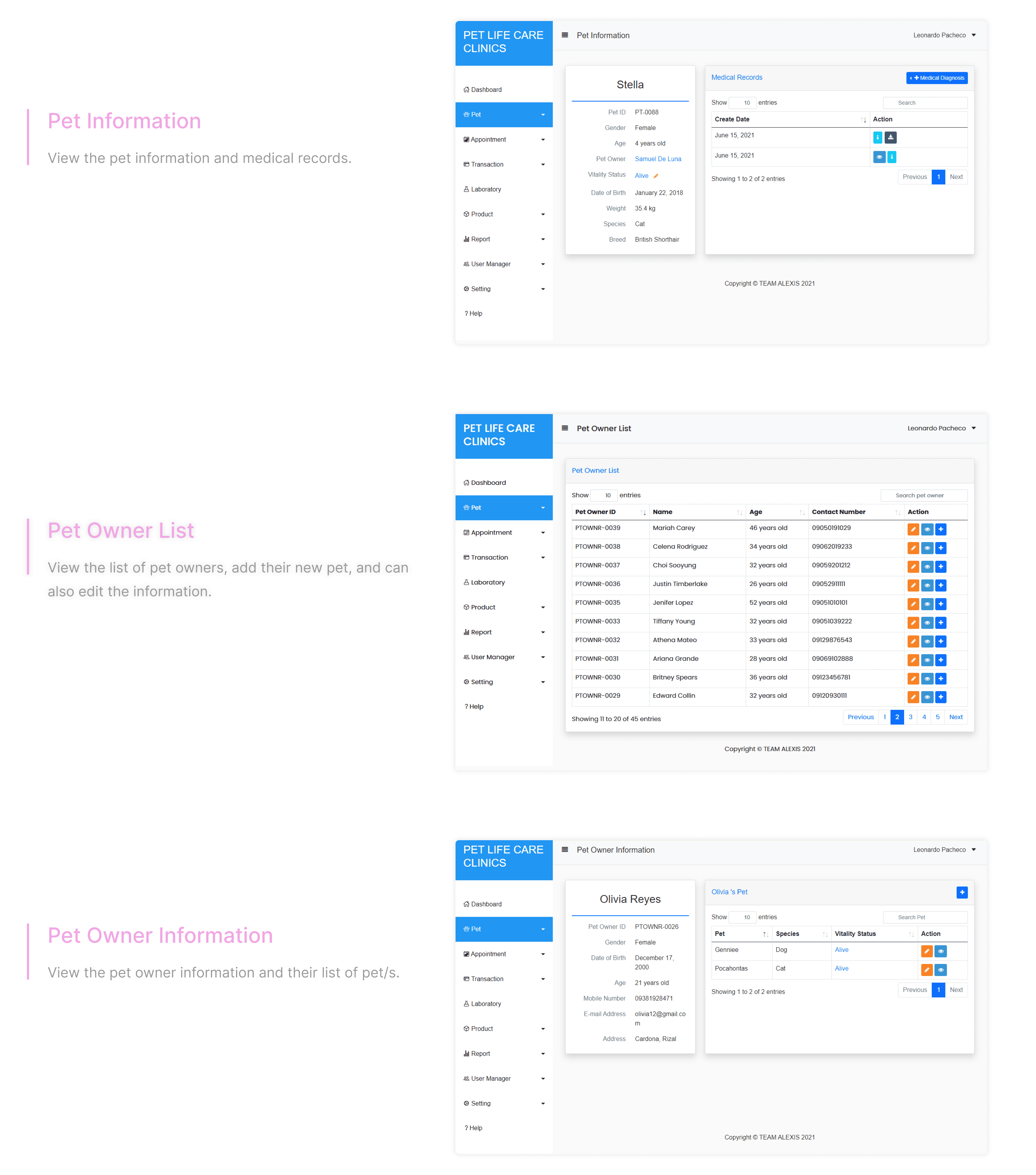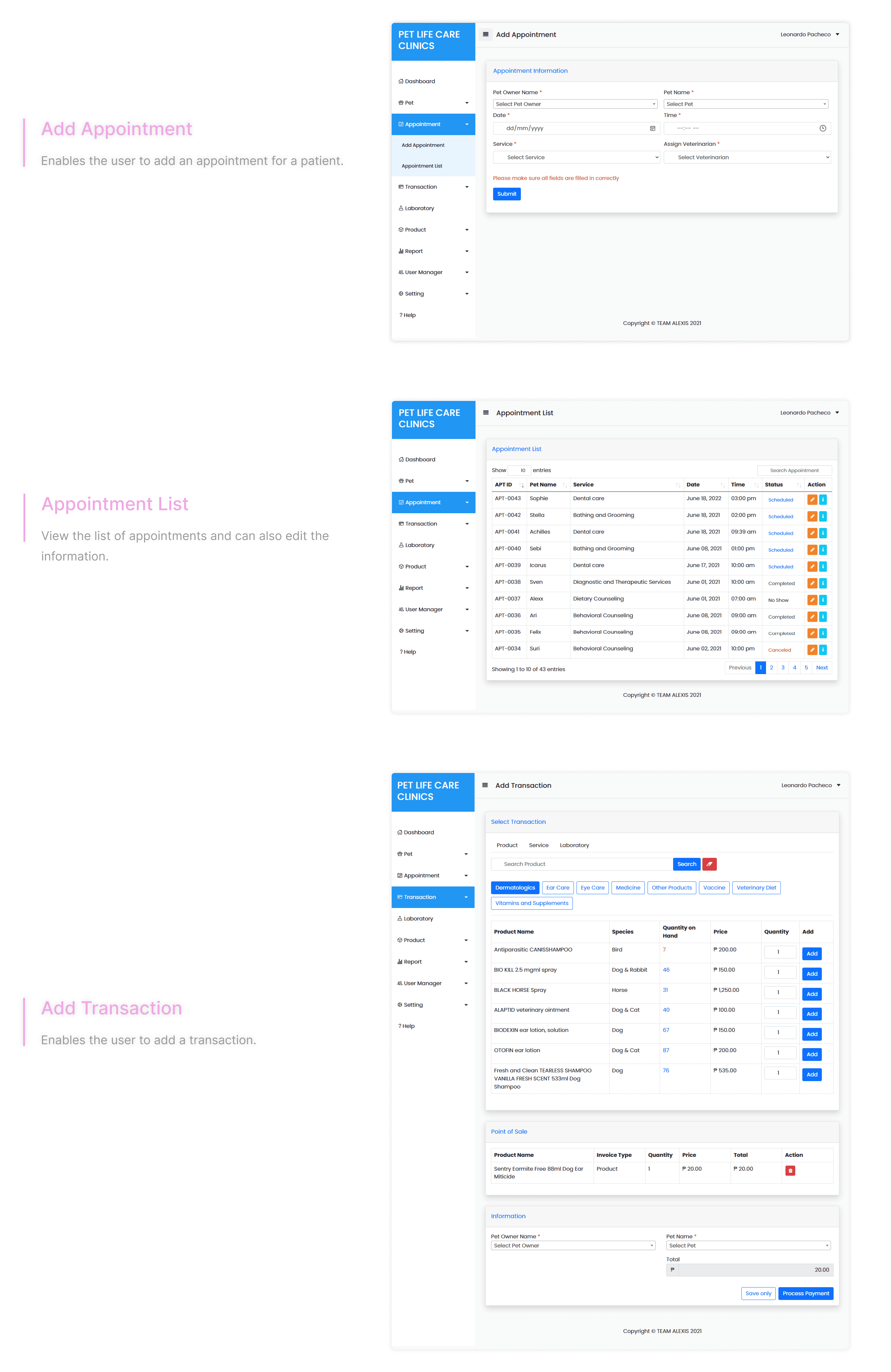 The Management Information System (MIS) for Veterinary Clinic is a tool designed to streamline the day-to-day operations of a veterinary clinic. It features a three-user interface—admin, veterinarian, and staff—and allows users to manage both pet and pet owner information. The system includes modules for appointment scheduling, laboratory management, transactions, inventory, reporting, and user management.